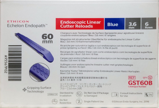 View full detailsEthicon Echelon Flex GST60B System 60 mm Reload, Blue, 60mm x 3.6mm, 6 rows, Box of 12